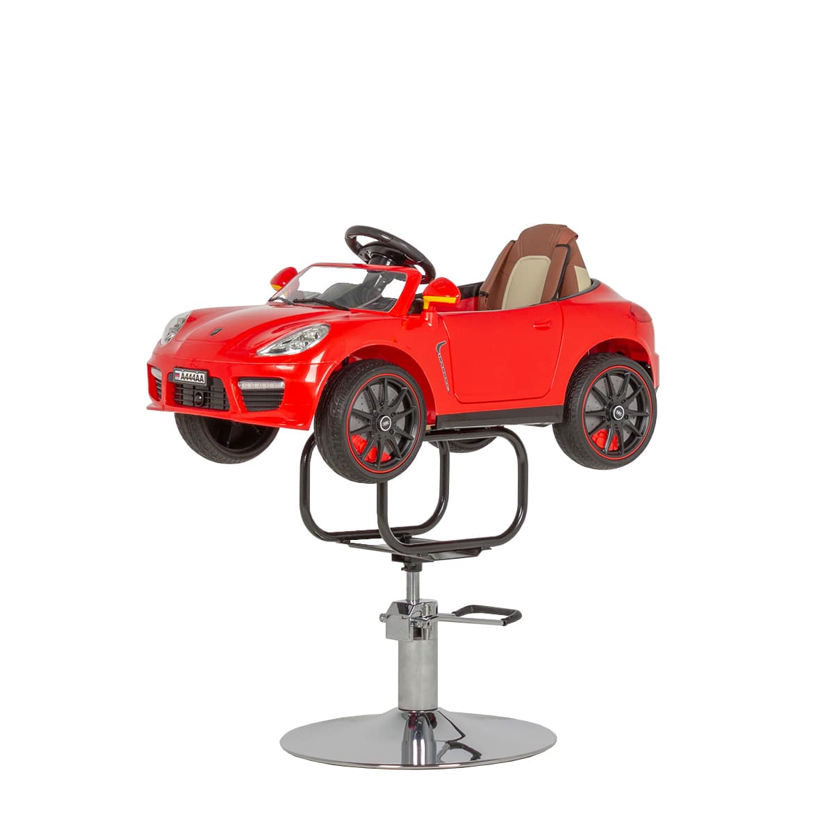 Детское парикмахерское кресло Машинка 02 стилизовано под спортивный кабриолет. Кресло имеет яркий, привлекающий внимание дизайн, благодаря чему прекрасно впишется в детскую зону салона красоты. Внутри автомобиля расположена приборная панель, руль, ключ зажигания. При повороте ключа машинка «заводится», зажигаются фары и фонари, подсвечивается панель приборов. Возможности детского парикмахерского кресла дополняет звуковой сигнал, магнитола и колонки для прослушивания музыки.