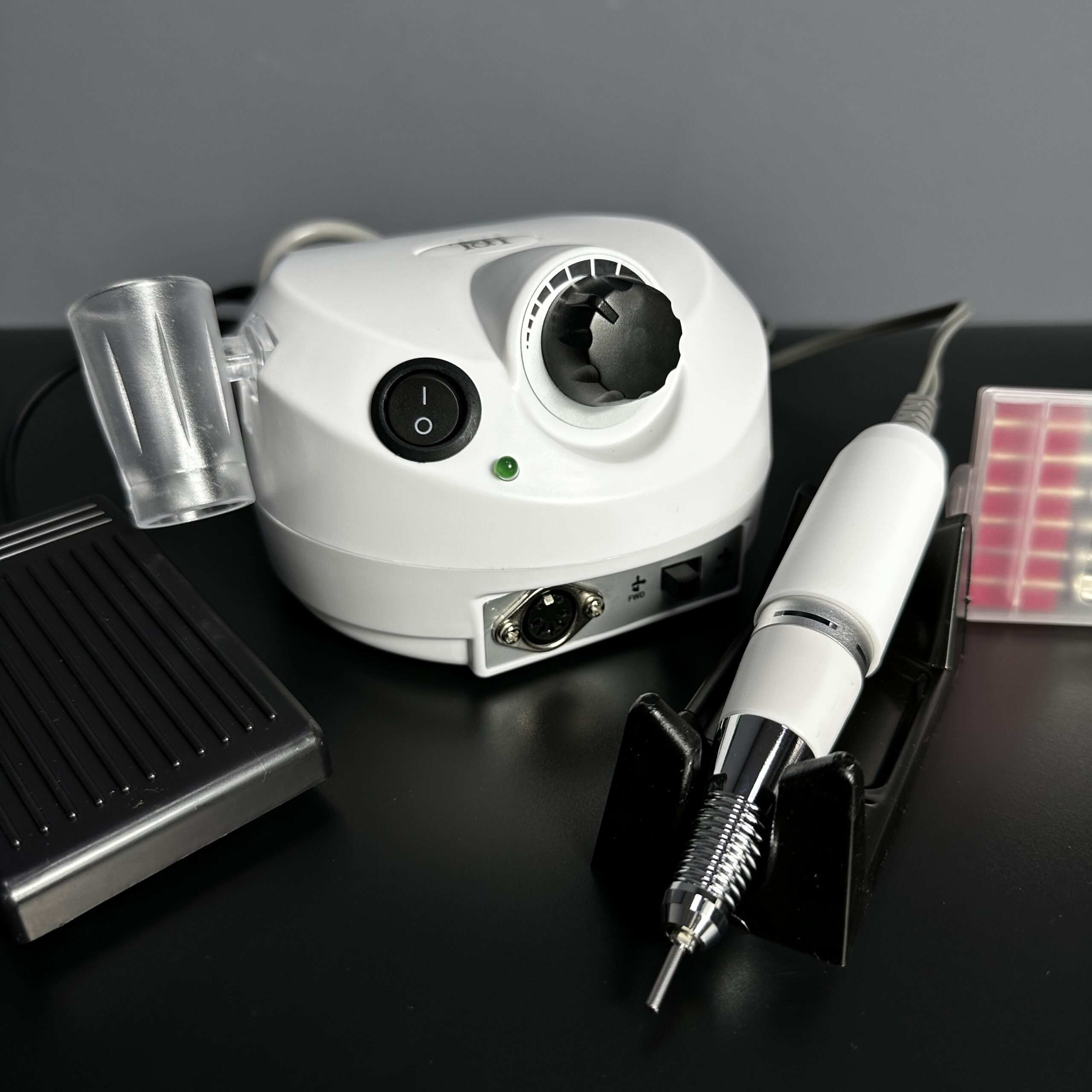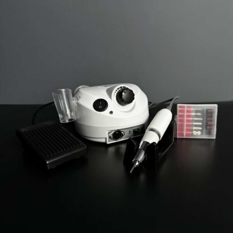 Комплектация: блок питания, ручка-дрель с заглушкой, 2 вида подставка для ручки, ножная педаль, набор фрез, инструкция.