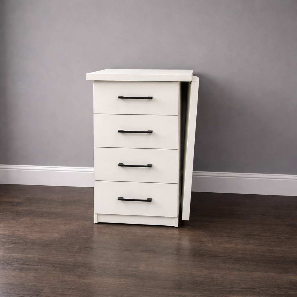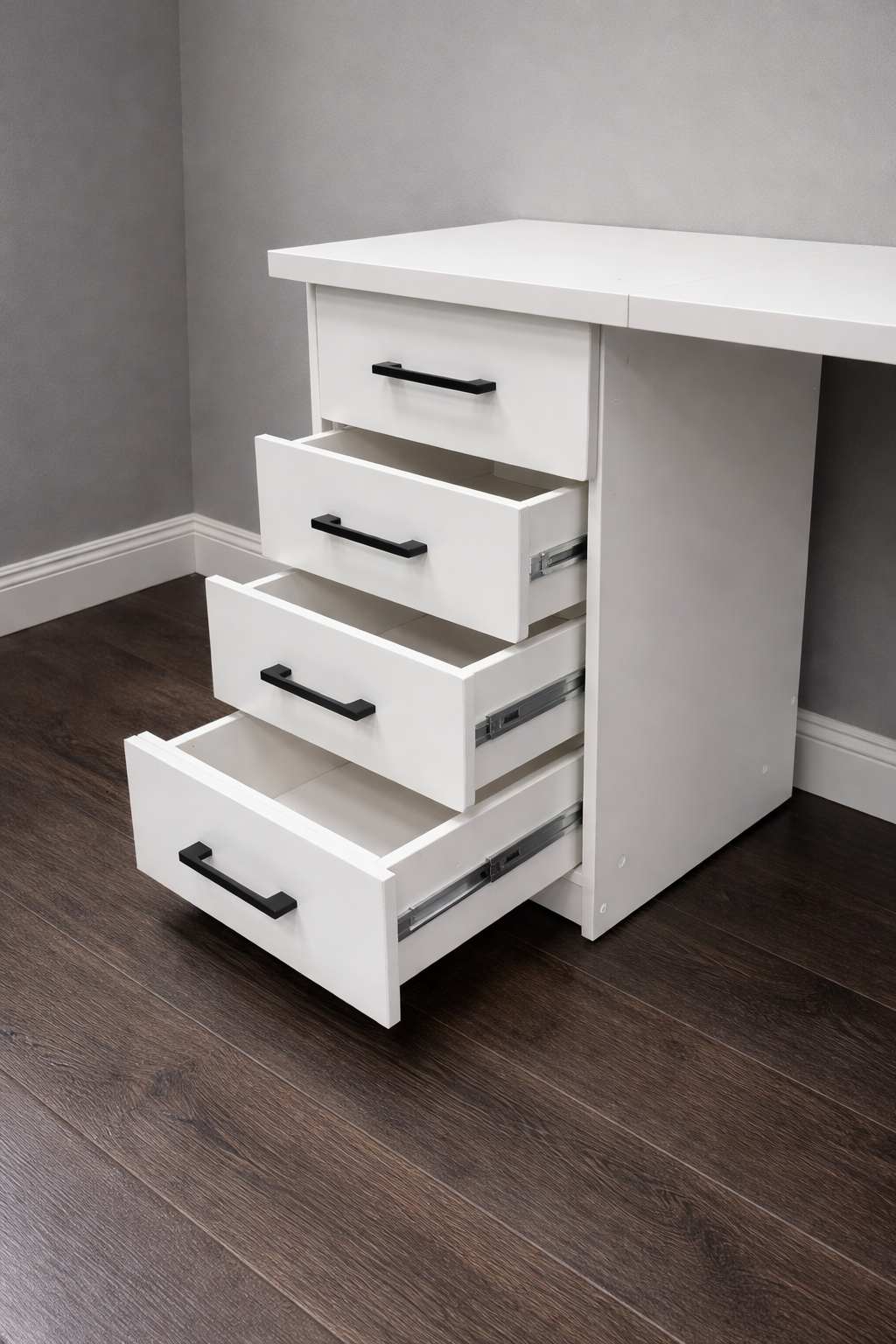 Имеет 4 выдвижных ящика с ручками.