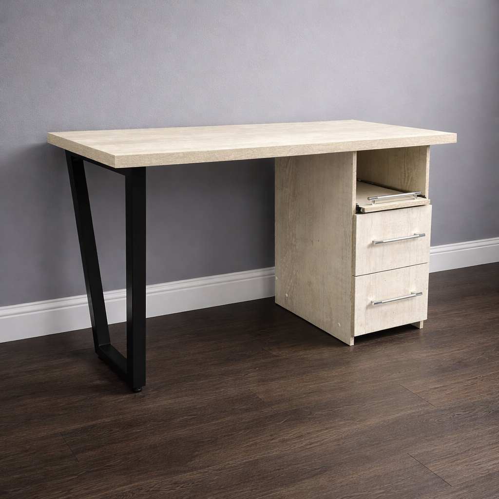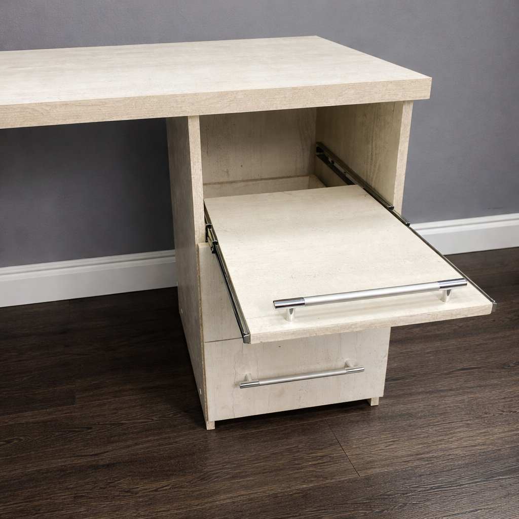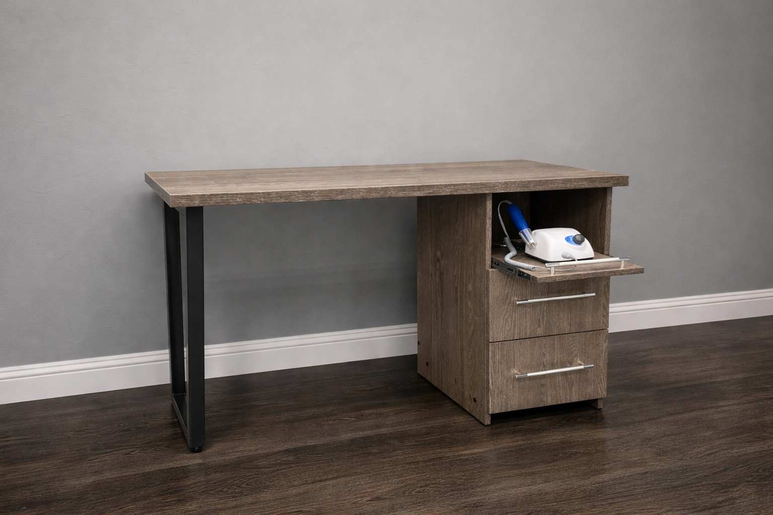 Внизу стола расположена вместительная тумба с двумя закрытыми выдвижными ящиками. В них можно хранить расходные материалы и мелкий инструмент. Также есть один открытый ящик, на котором можно разместить необходимый в работе аппарат.