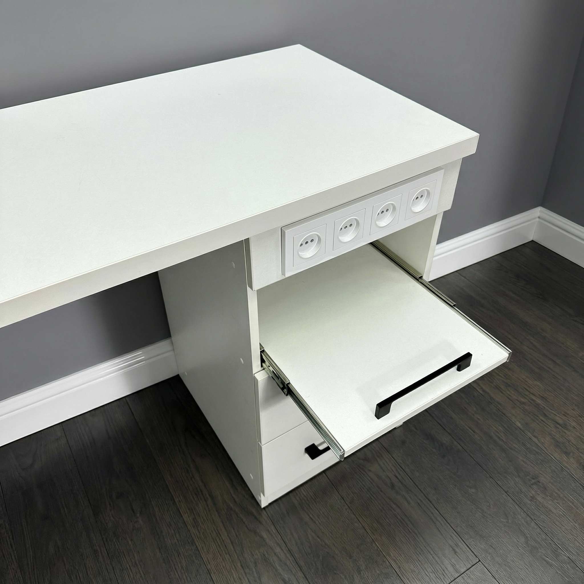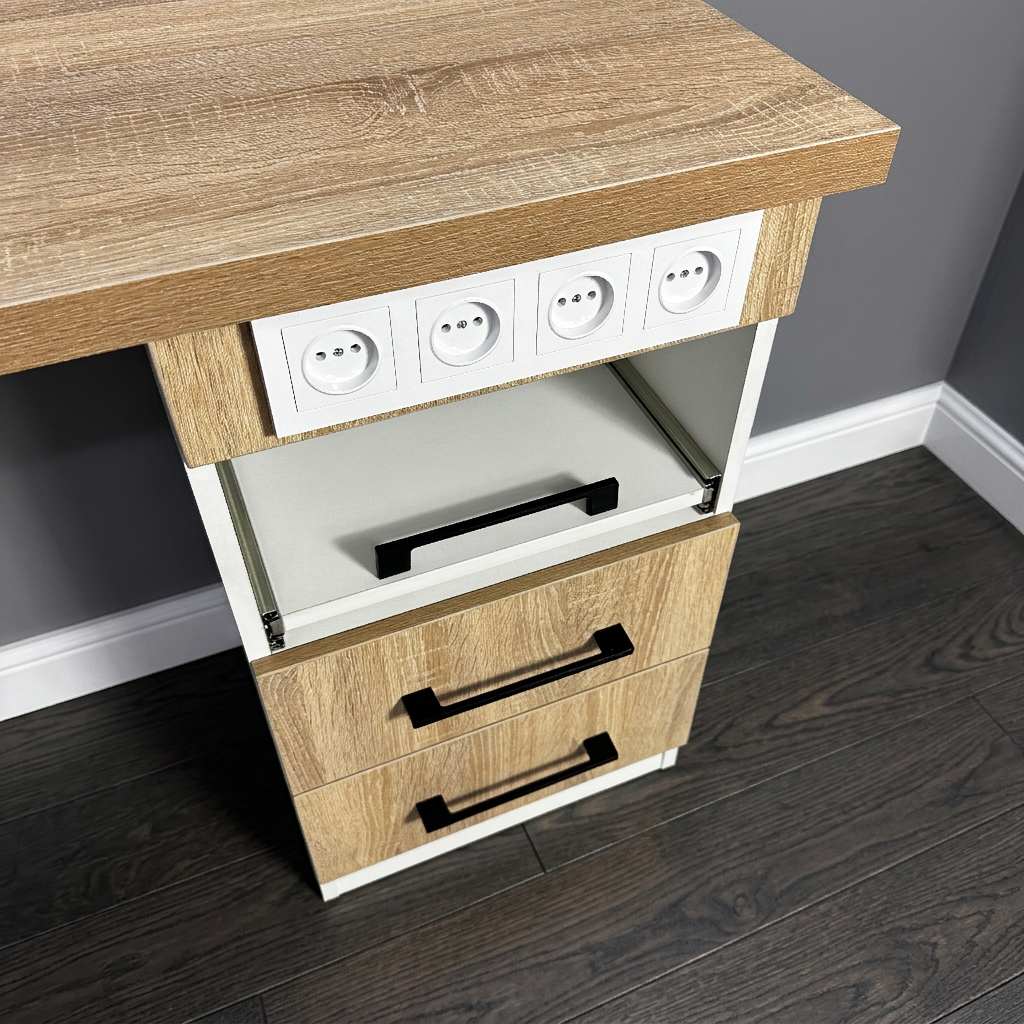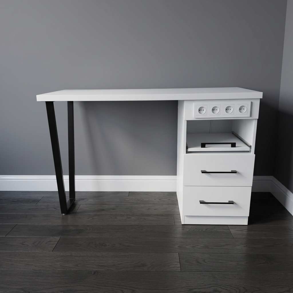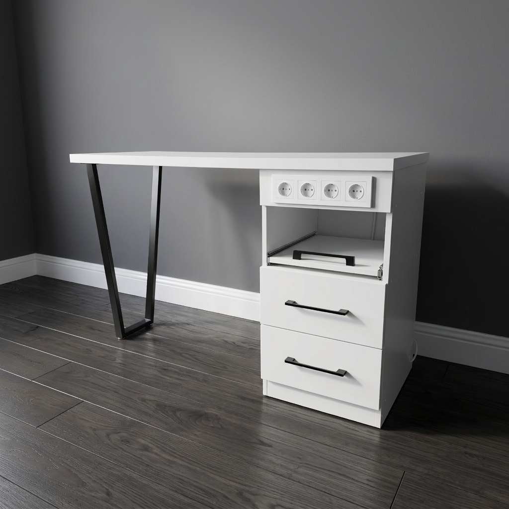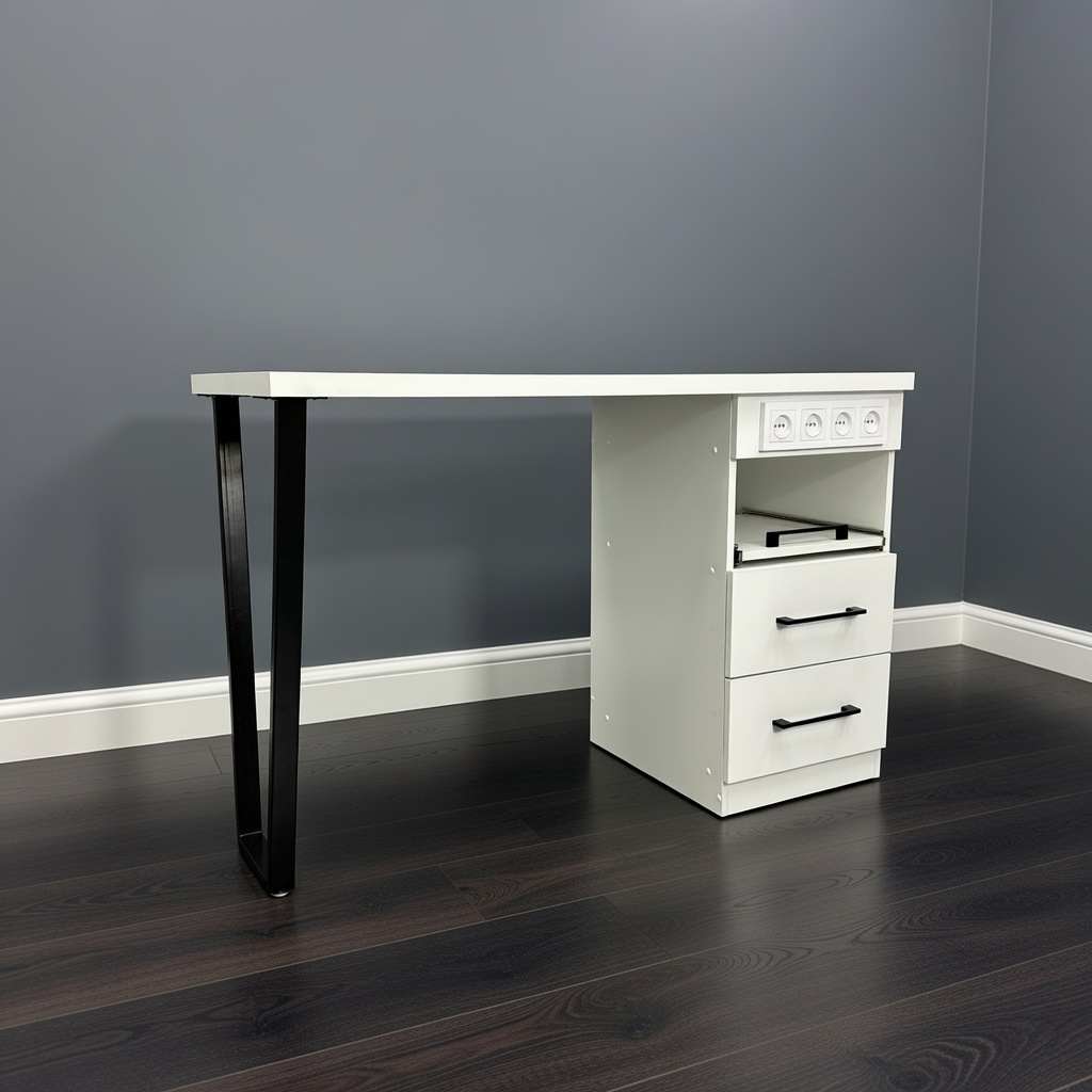 Стол состоит из широкой столешницы на металлических ножках, которые легко регулируются для размещения на любом уровне пола. В комплект также входит вместительная тумба с двумя закрытыми выдвижными ящиками для расходных материалов и мелкого инструмента и одним открытым ящиком, на котором можно разместить необходимый аппарат.