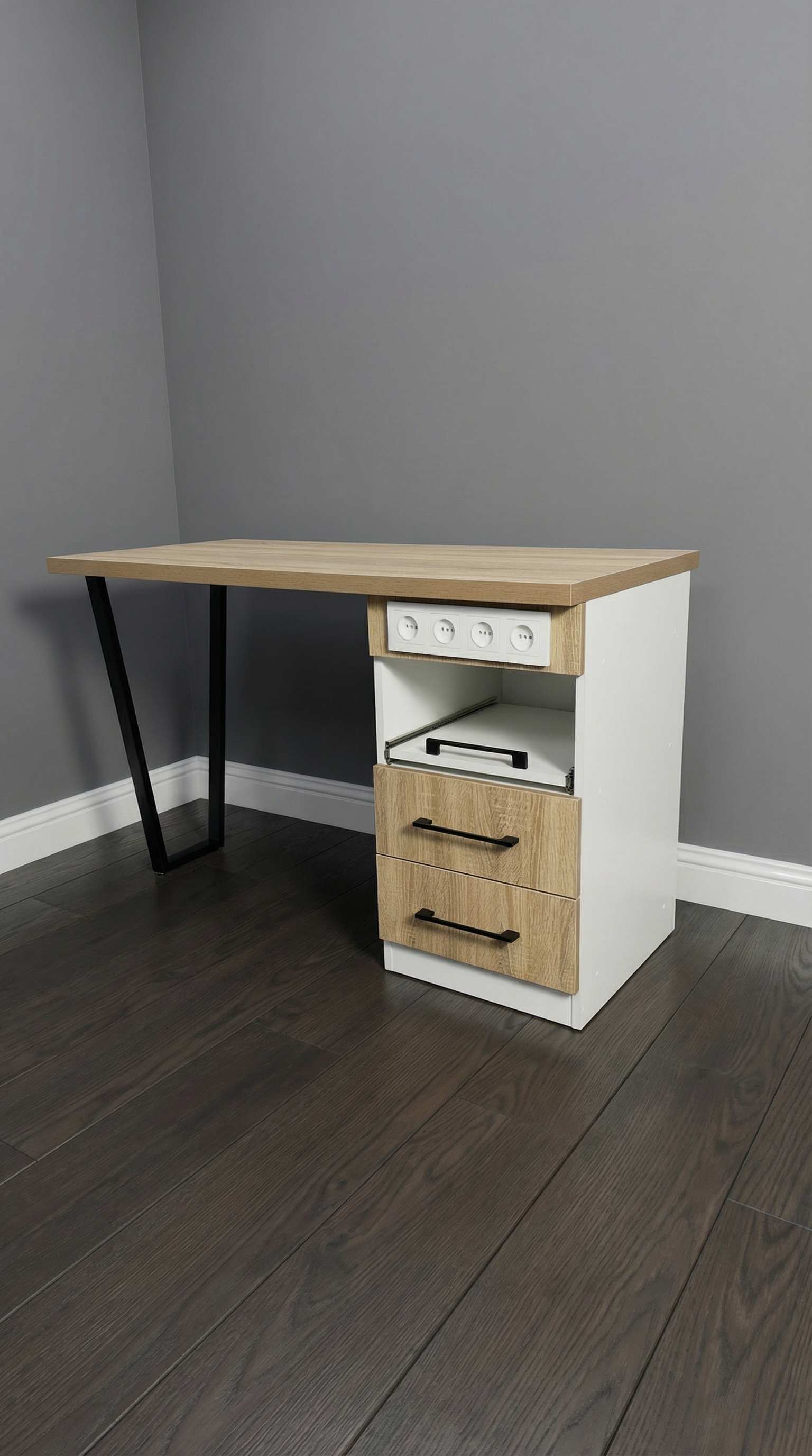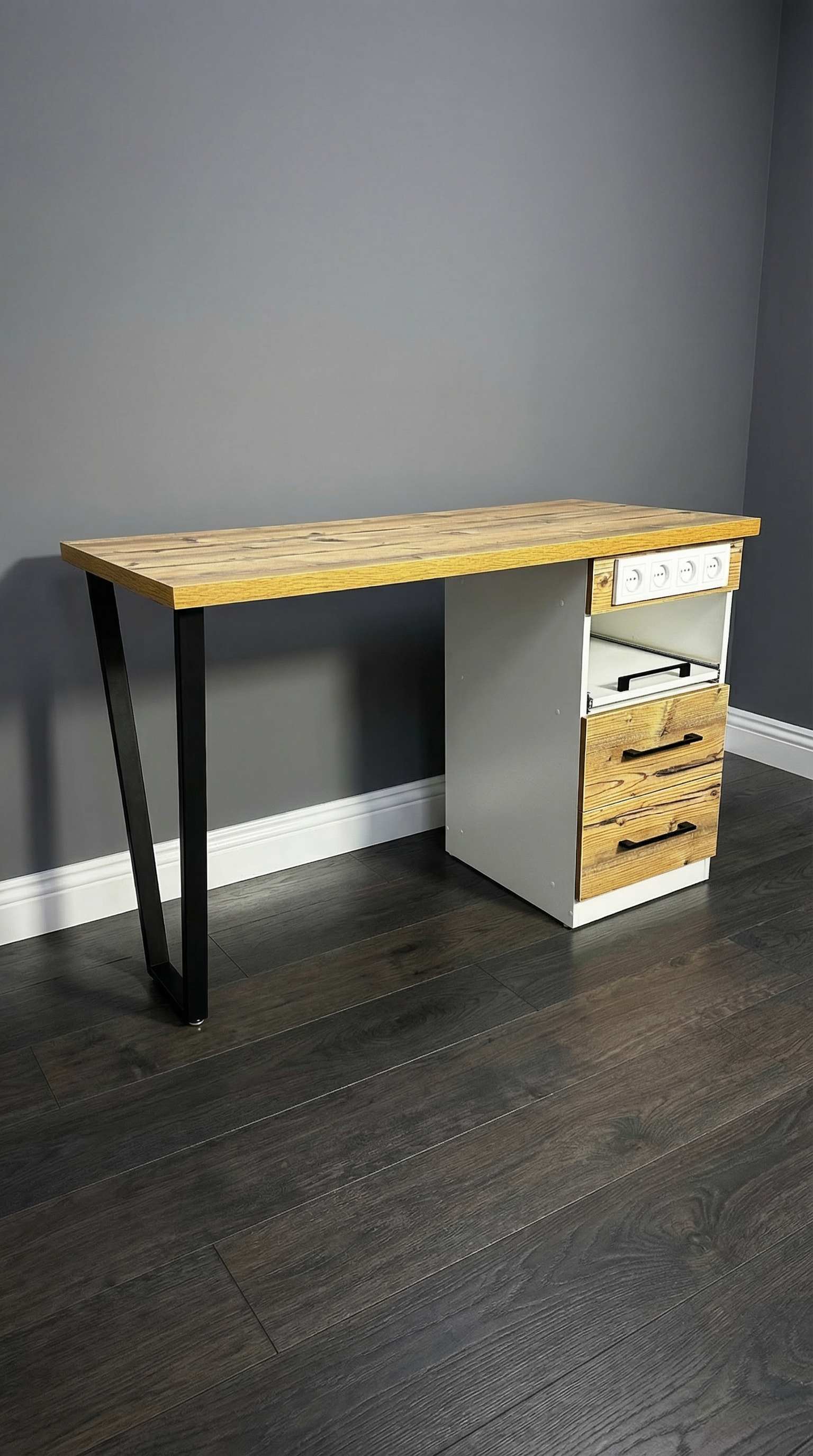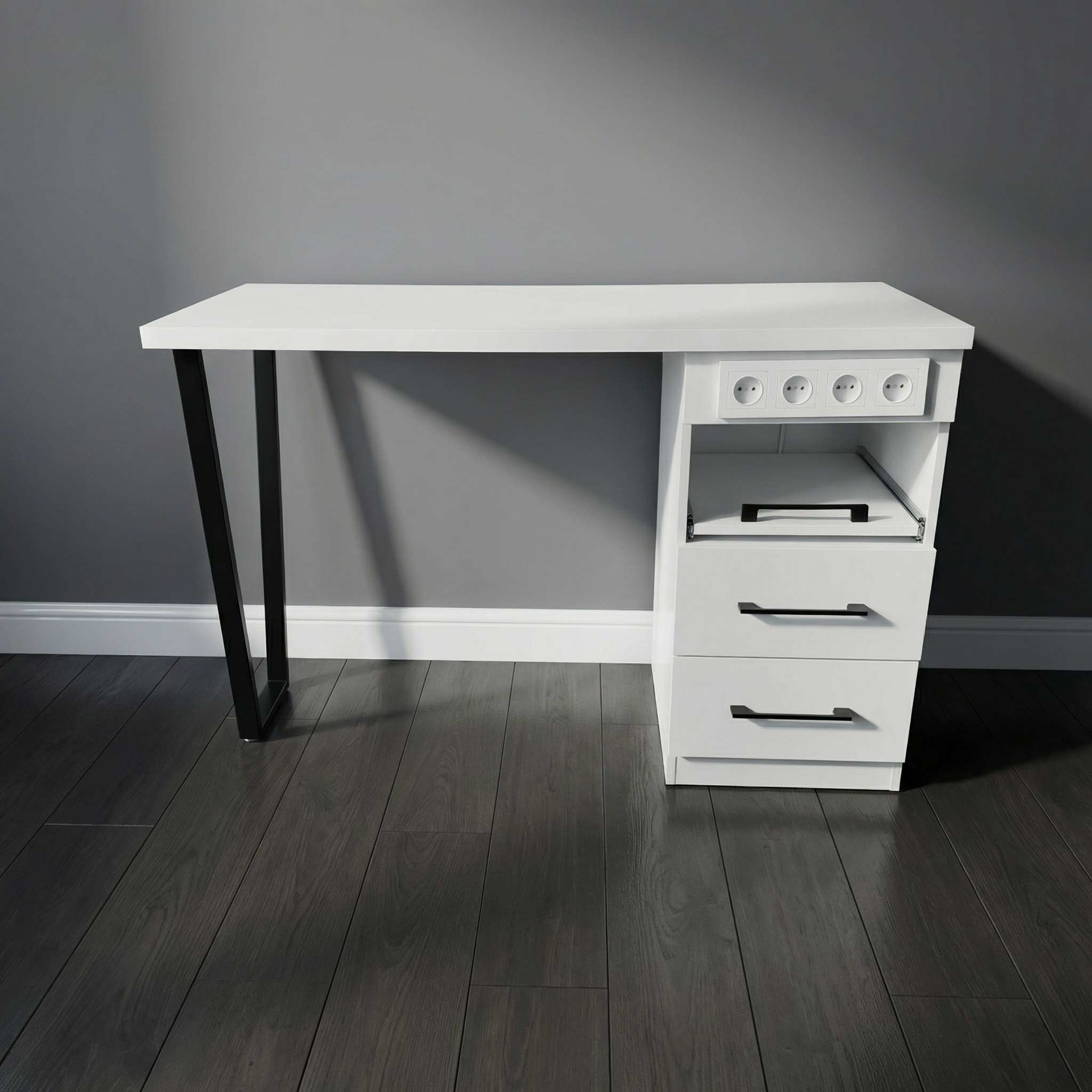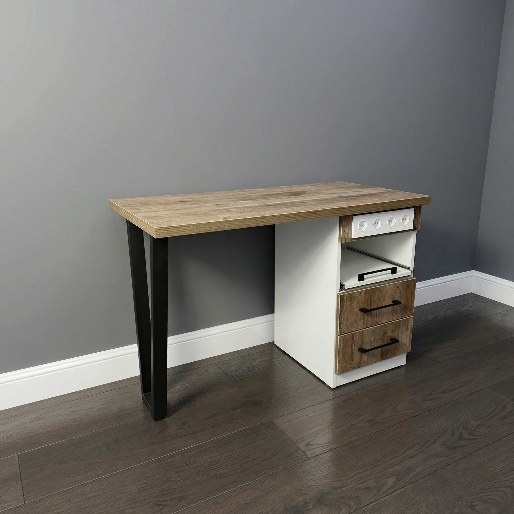 Стол состоит из широкой столешницы на металлических ножках, которые легко регулируются для размещения на любом уровне пола. В комплект также входит вместительная тумба с двумя закрытыми выдвижными ящиками для расходных материалов и мелкого инструмента и одним открытым ящиком, на котором можно разместить необходимый аппарат.
