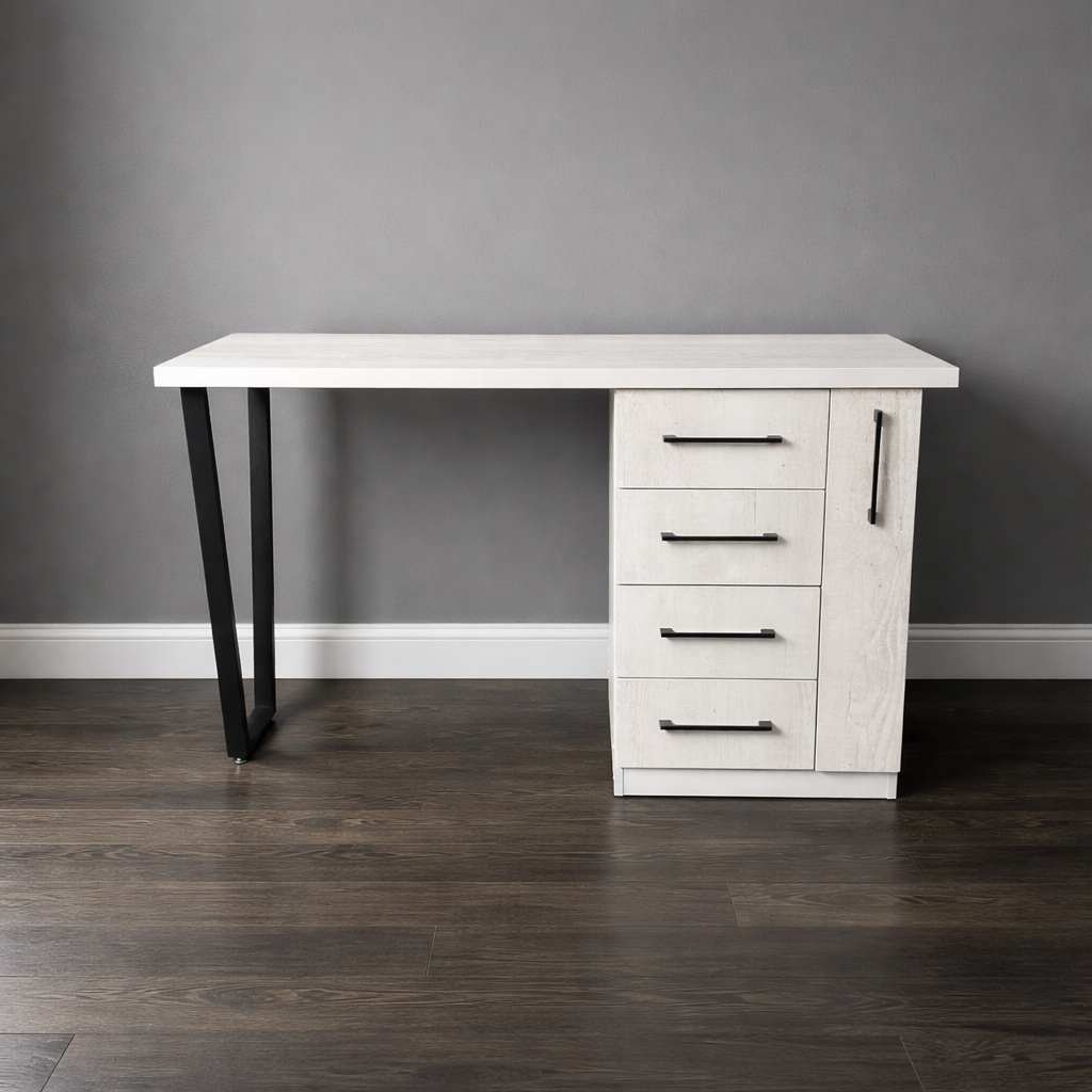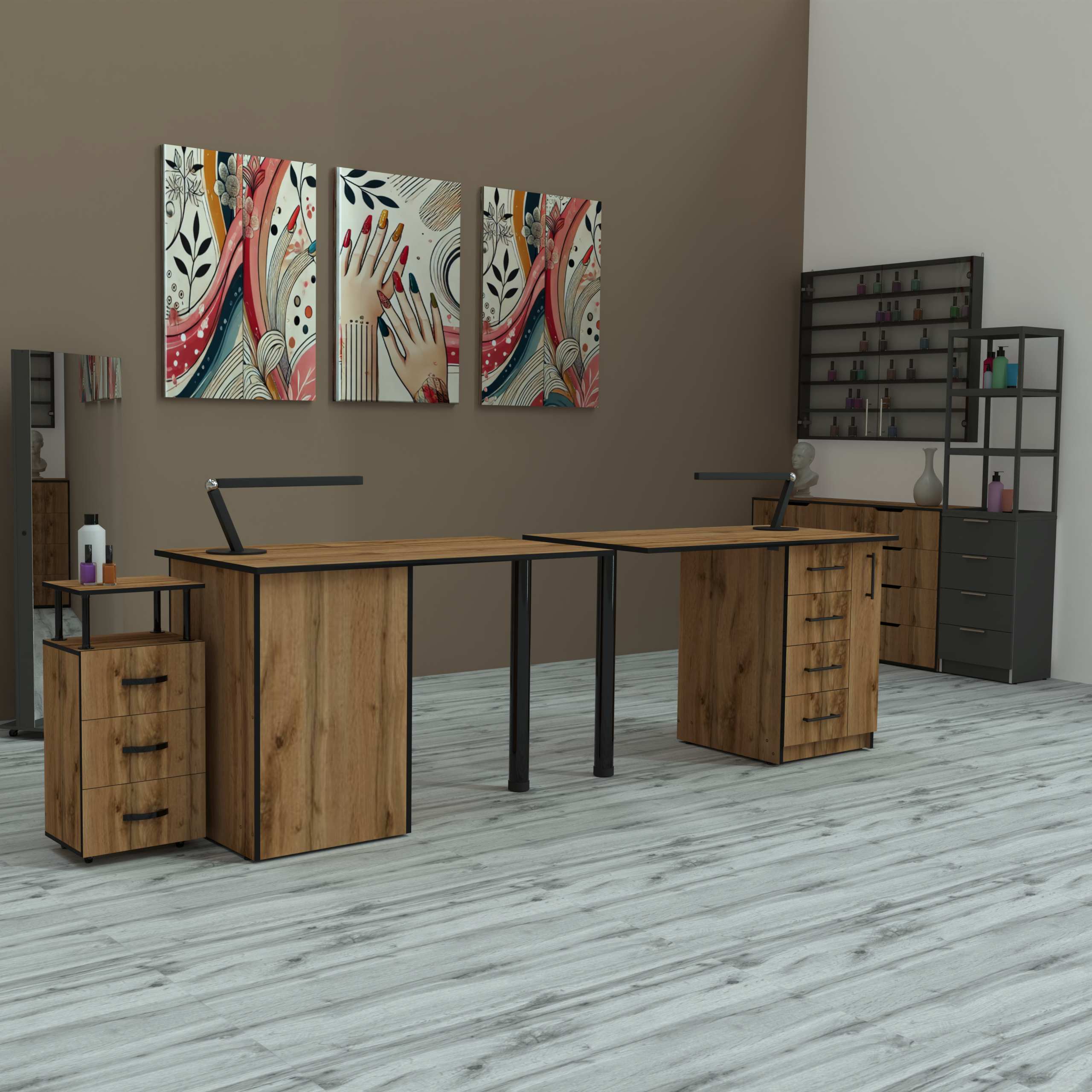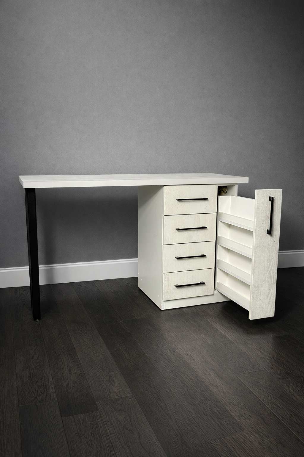 Конструкцию дополняет вместительная тумба, оснащённая четырьмя выдвижными ящиками закрытого типа и выдвижной вертикальной полкой для хранения гель-лаков.