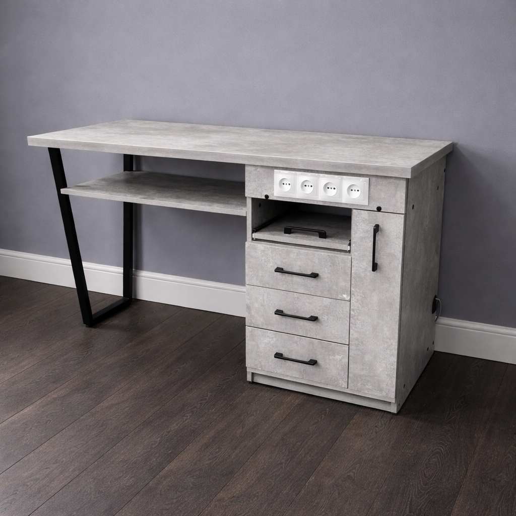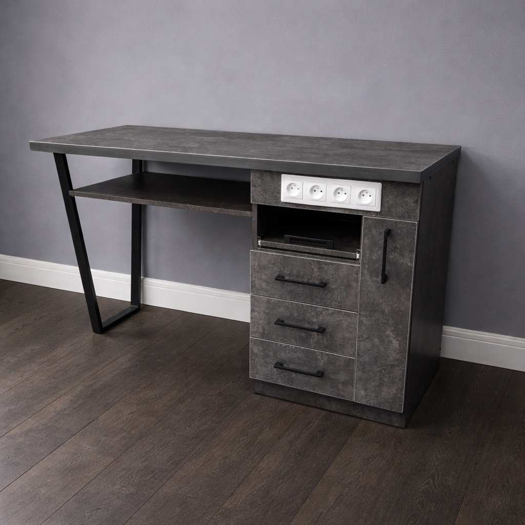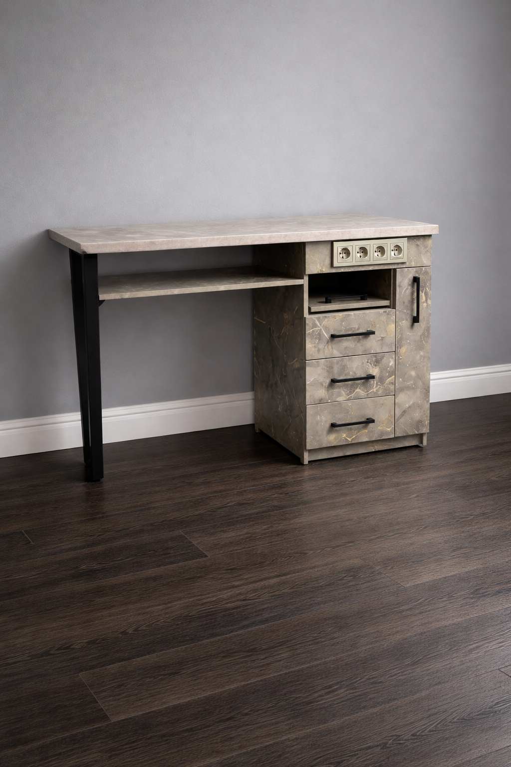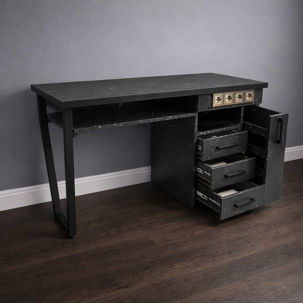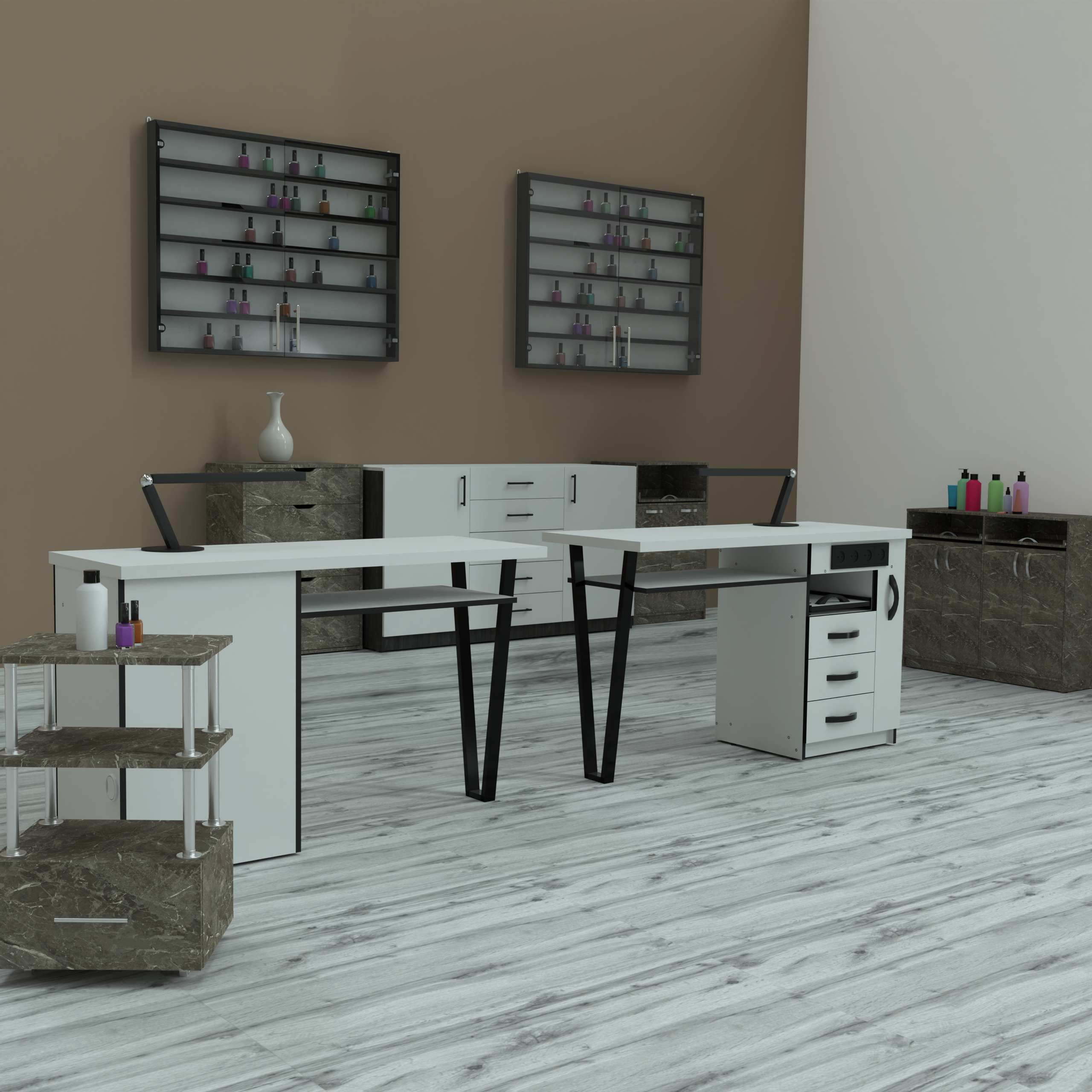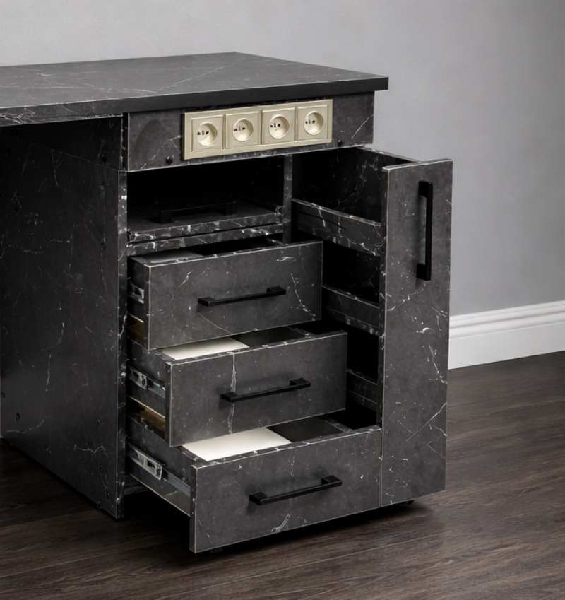 Конструкцию дополняет вместительная тумба, оснащённая тремя выдвижными ящиками закрытого типа, выдвижной открытой полкой и вертикальной полкой для хранения гель-лаков.