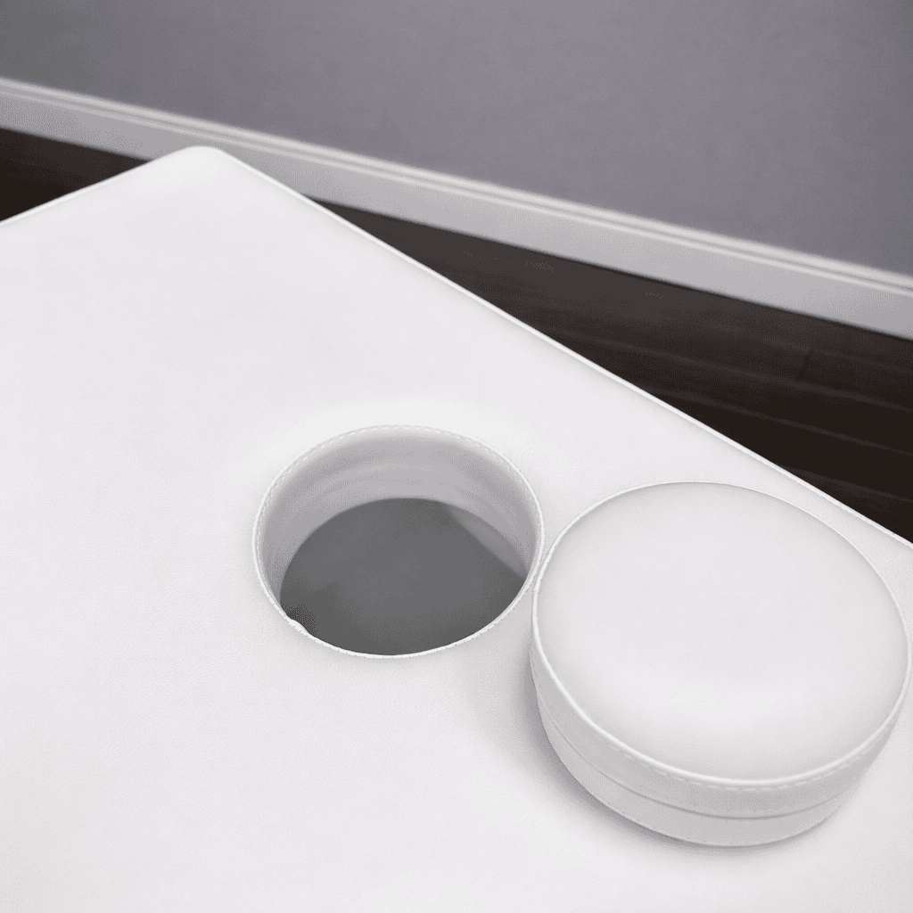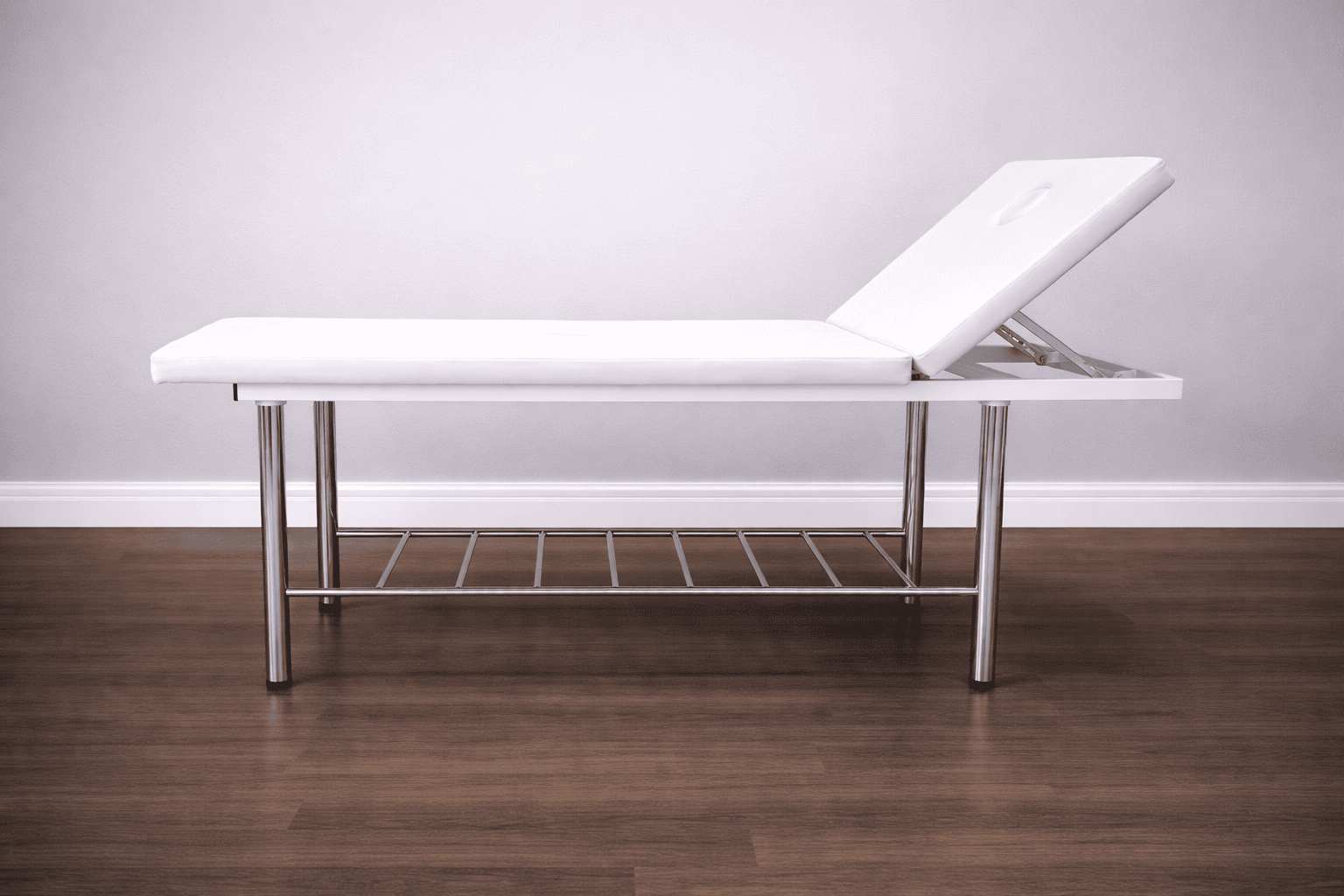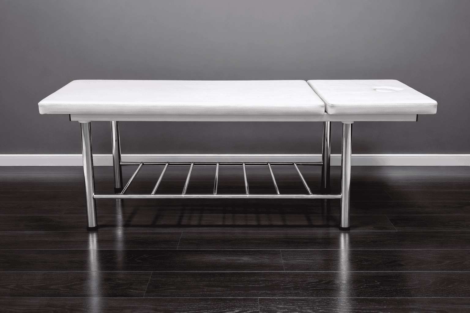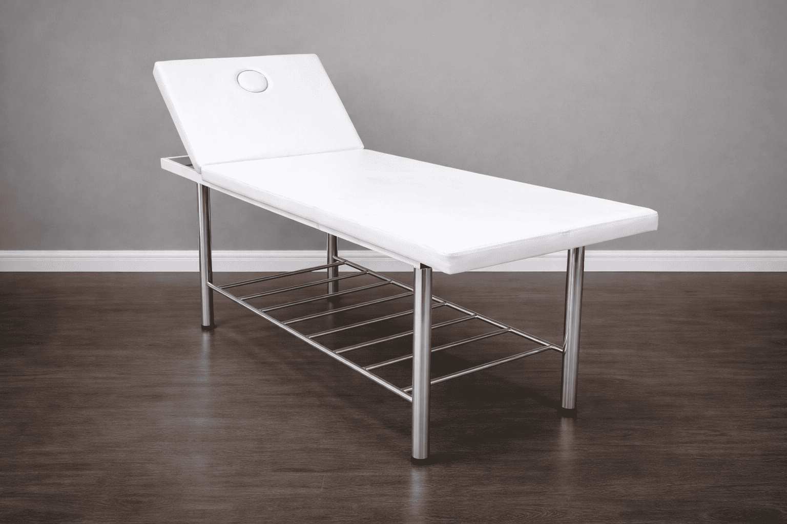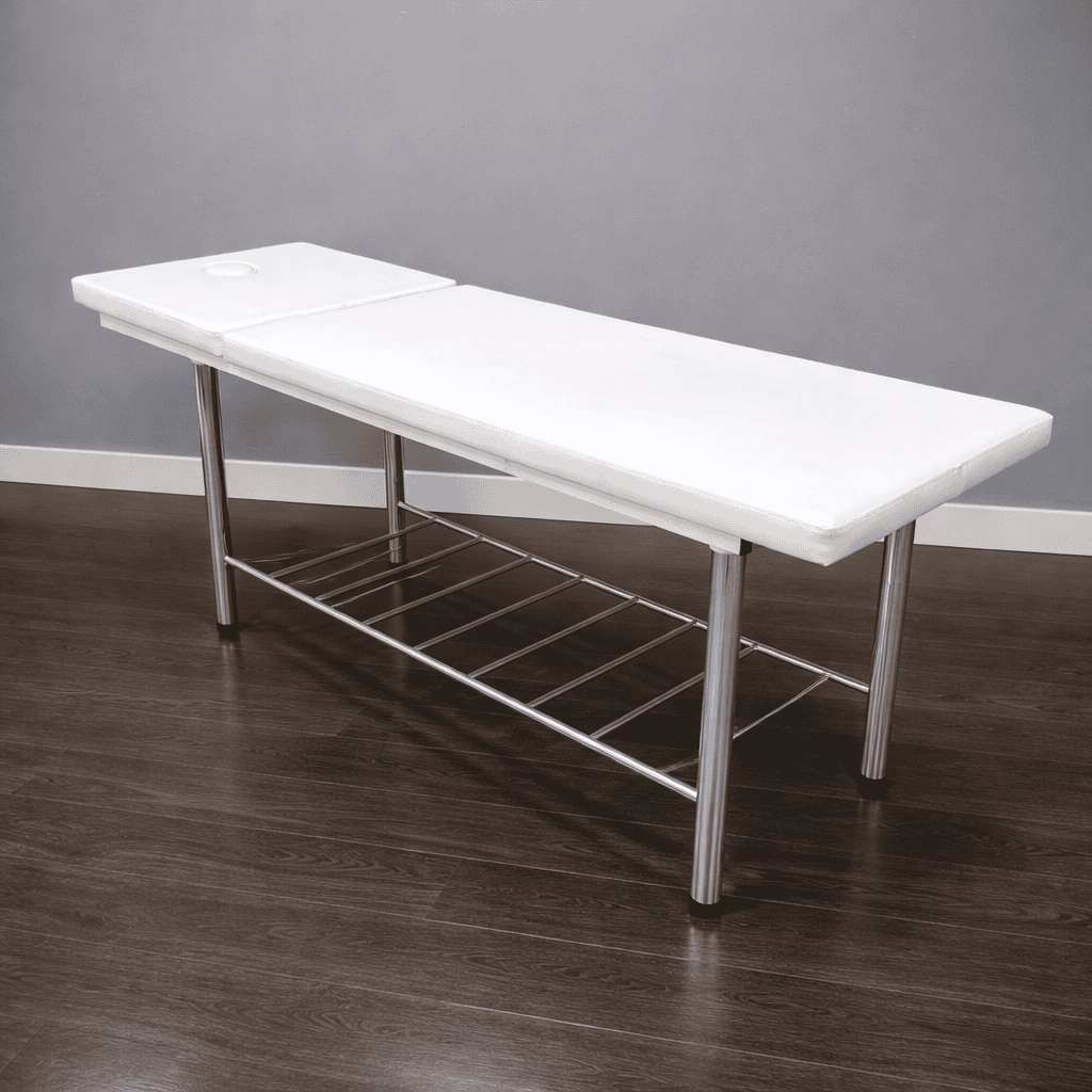 Кушетка массажная стационарная на металлическом хромированном каркасе с механической регулировкой подголовника и отверстием для лица.