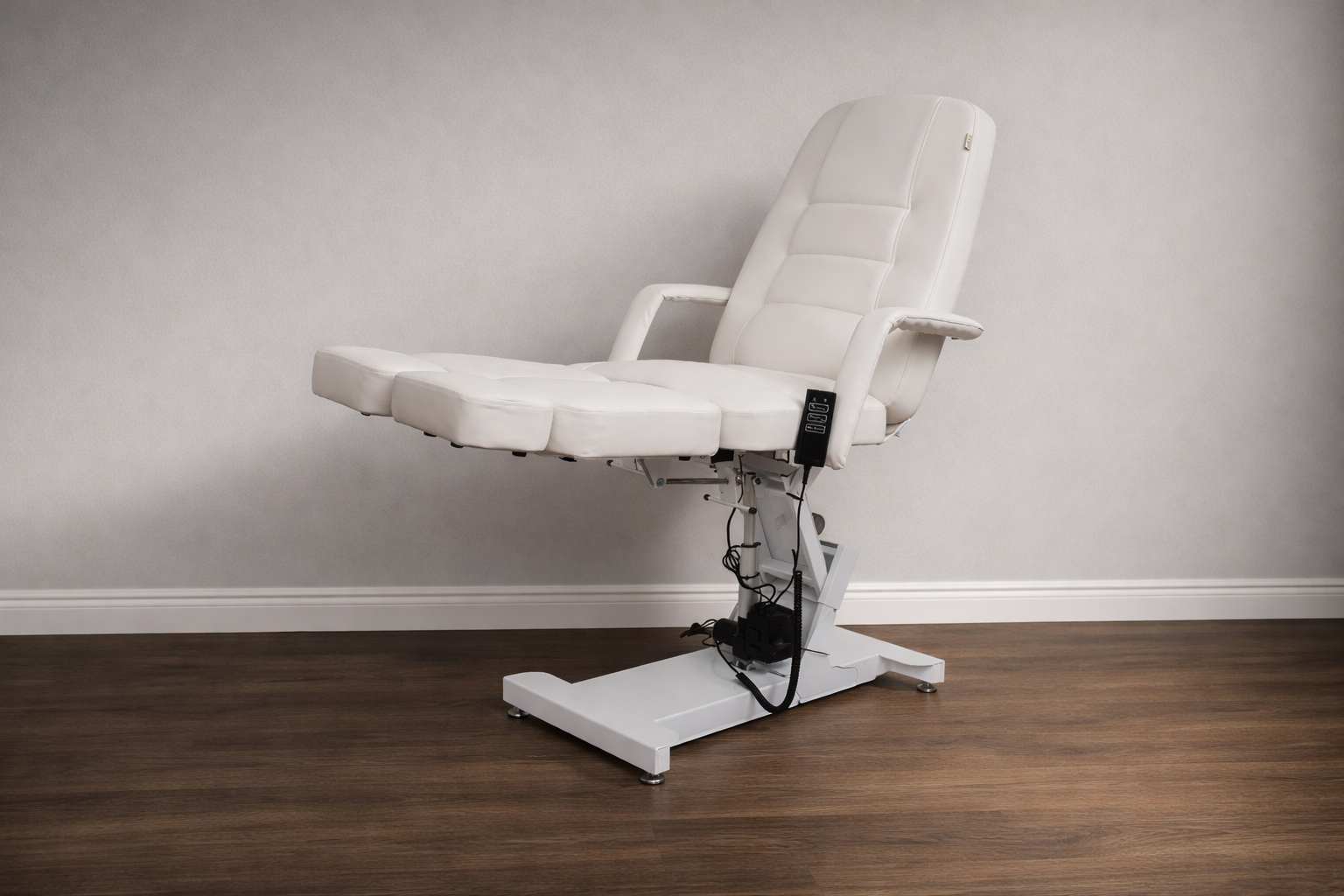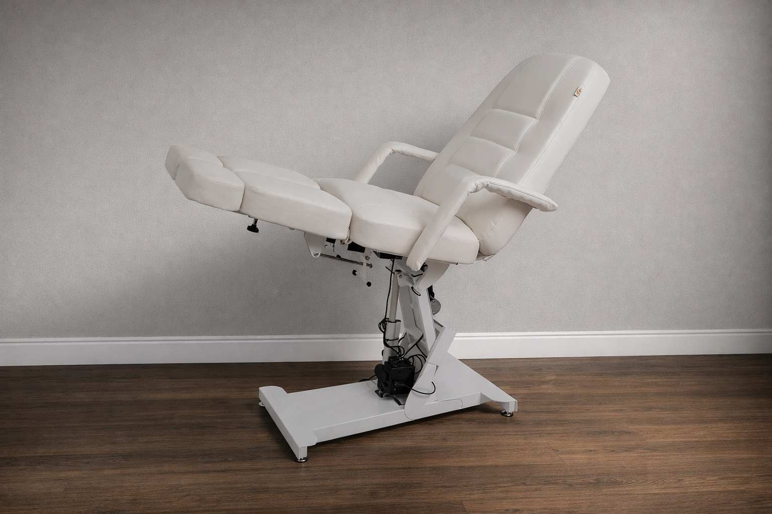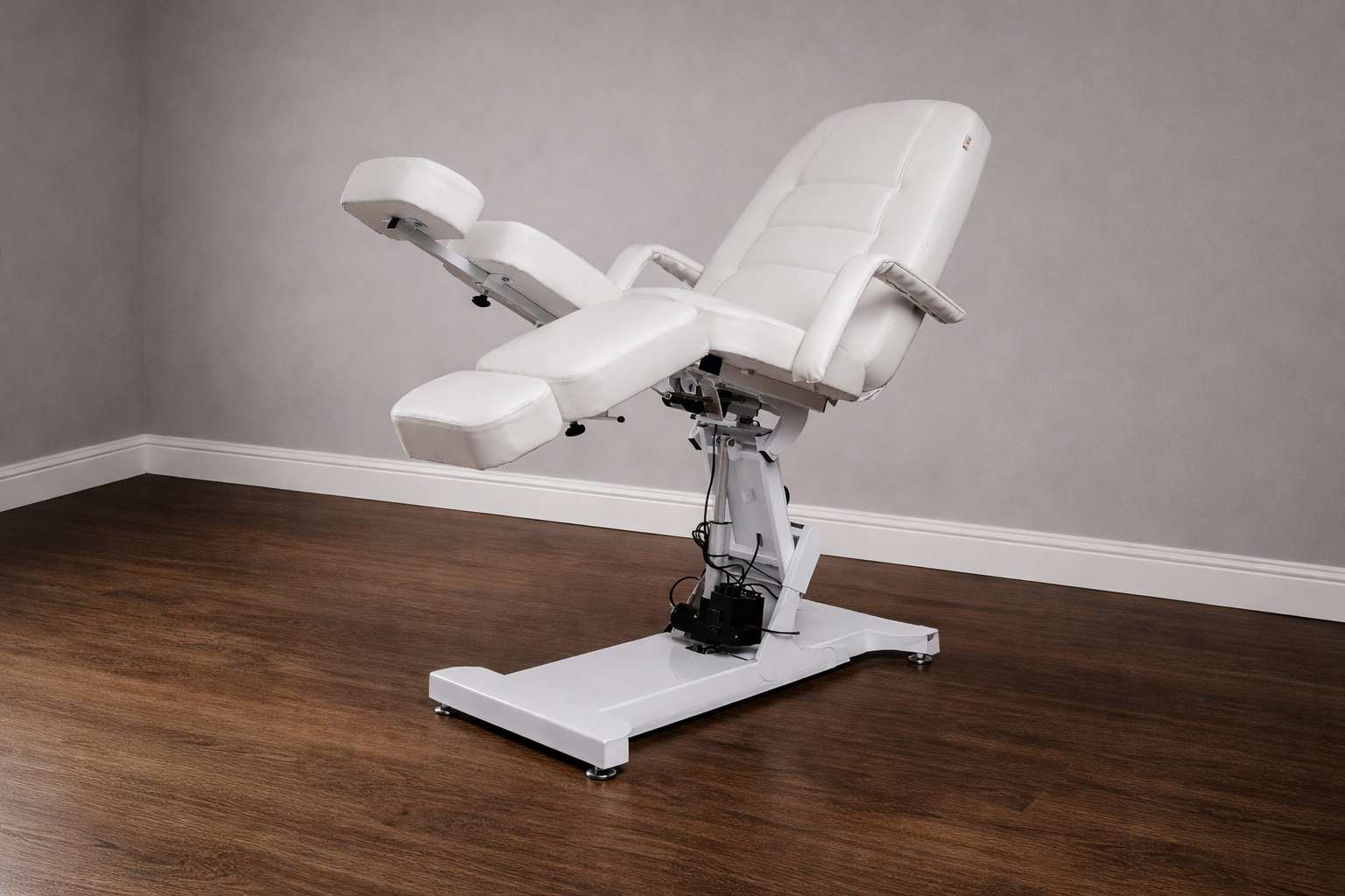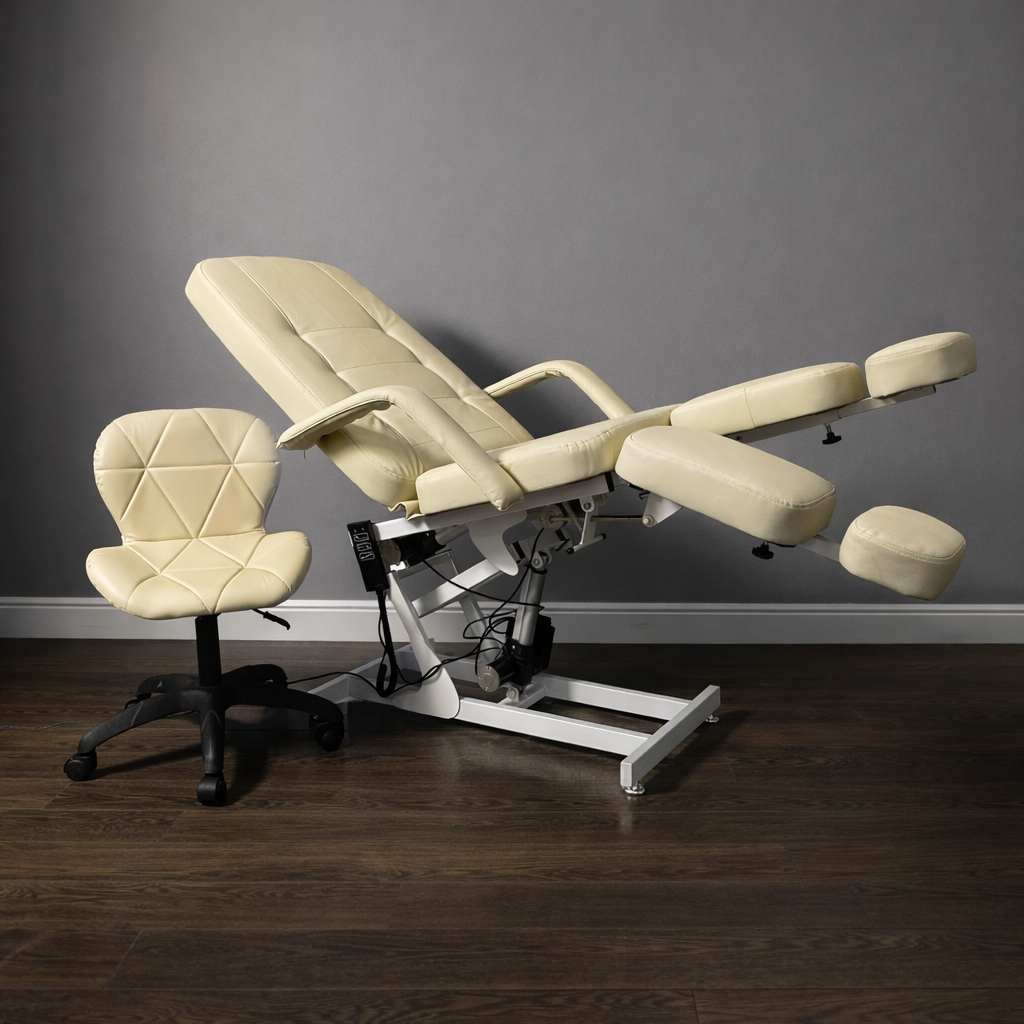 Кресло педикюрное «Элегант 3» с регулировкой высоты, спины и угла наклона сиденья на электроприводах (3 мотора). Для сохранения устойчивости головной части и всего кресла в целом верхняя платформа установлена на специальном рычажном механизме и не качается во время работы с клиентом. А также для укрепления жесткости спинной части она усилена дополнительной металлической рамкой.