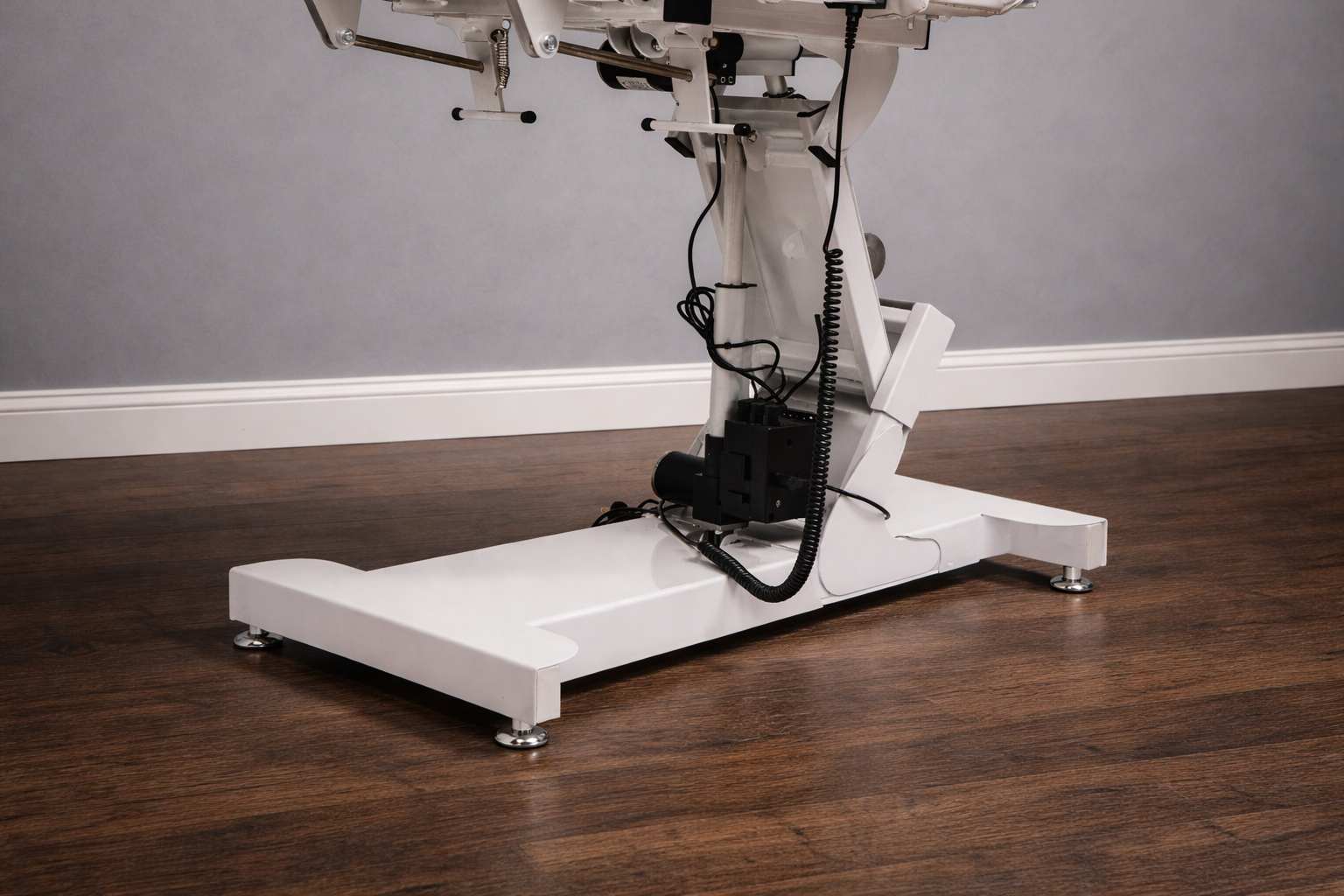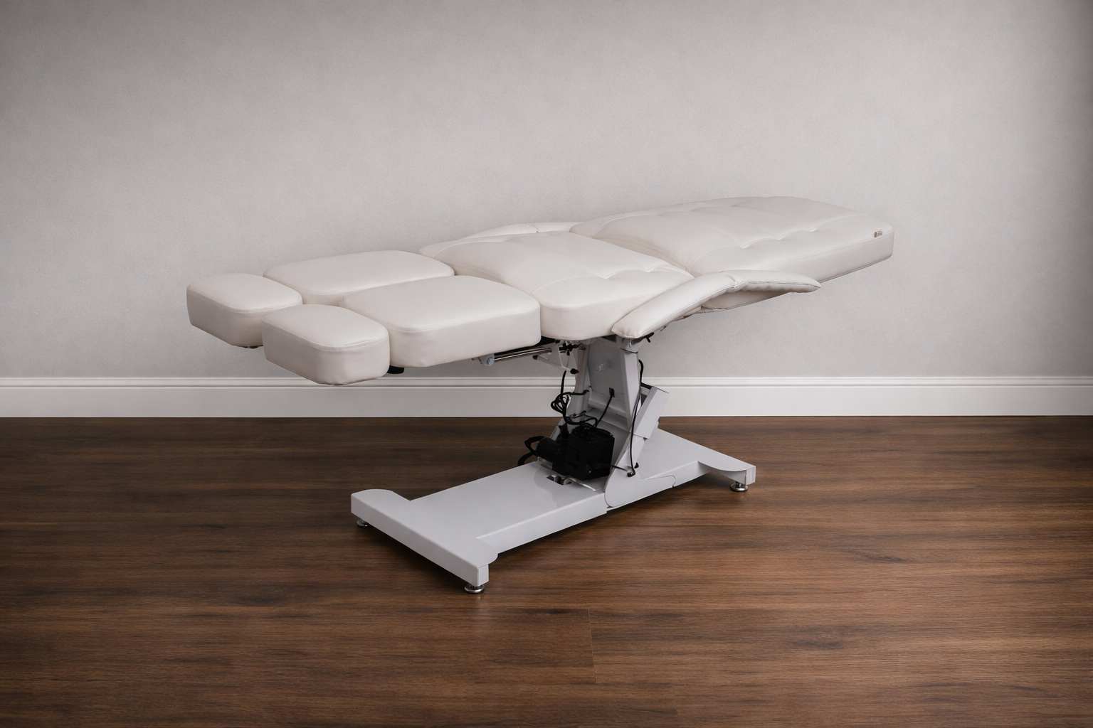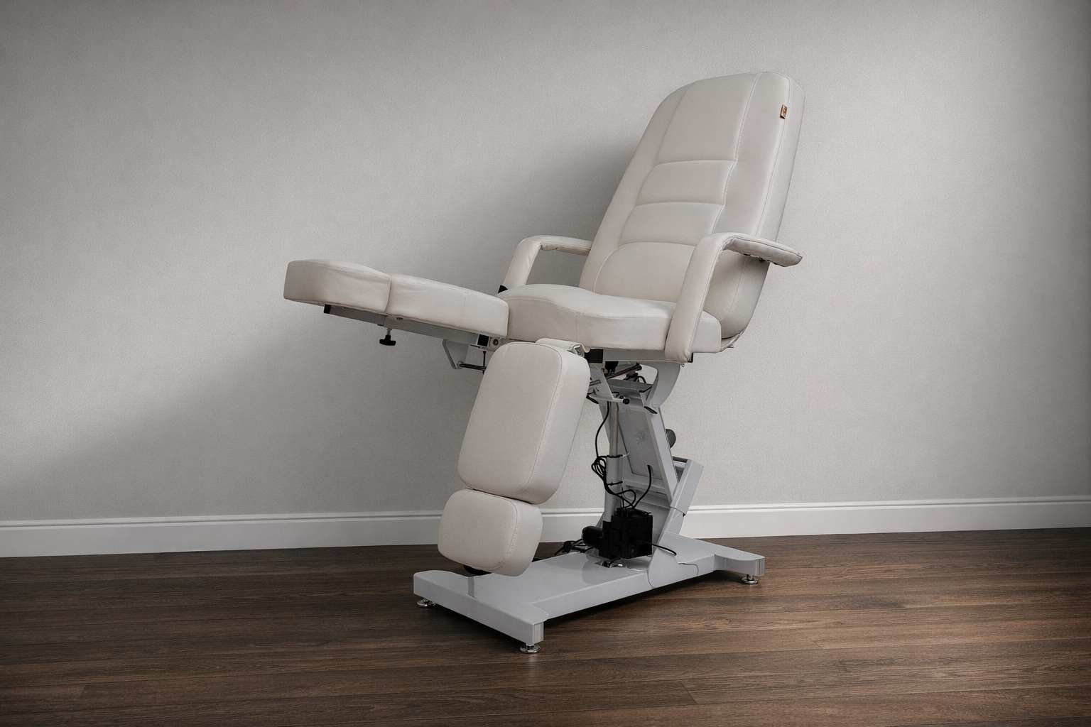 Кресло педикюрное «Элегант 3» с регулировкой высоты, спины и угла наклона сиденья на электроприводах (3 мотора). Для сохранения устойчивости головной части и всего кресла в целом верхняя платформа установлена на специальном рычажном механизме и не качается во время работы с клиентом. А также для укрепления жесткости спинной части она усилена дополнительной металлической рамкой.