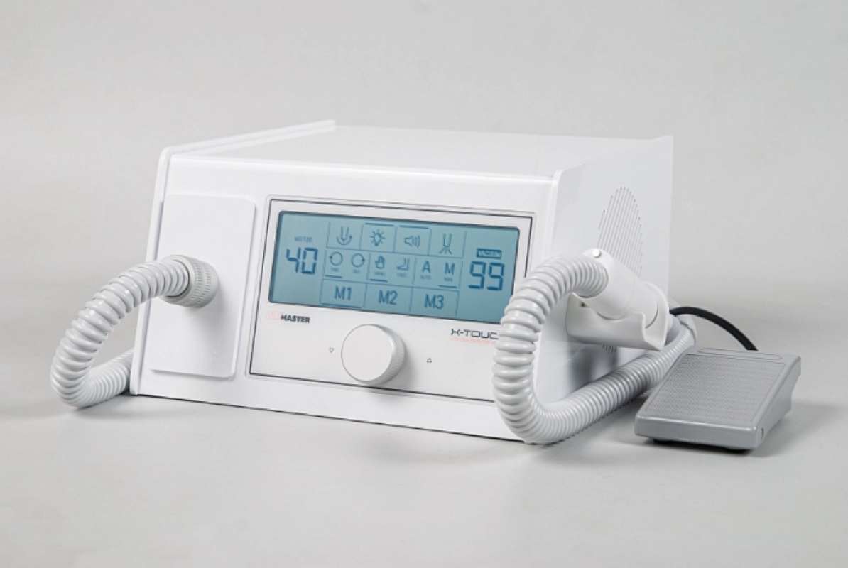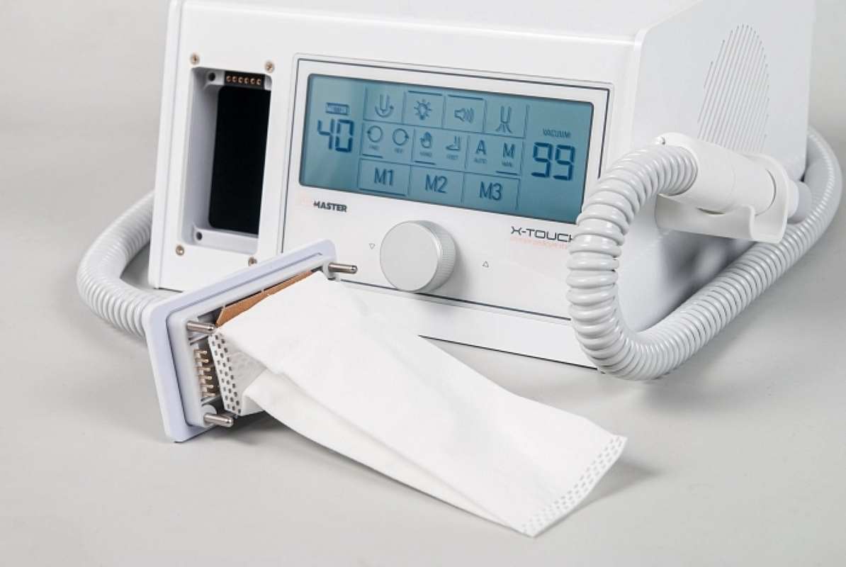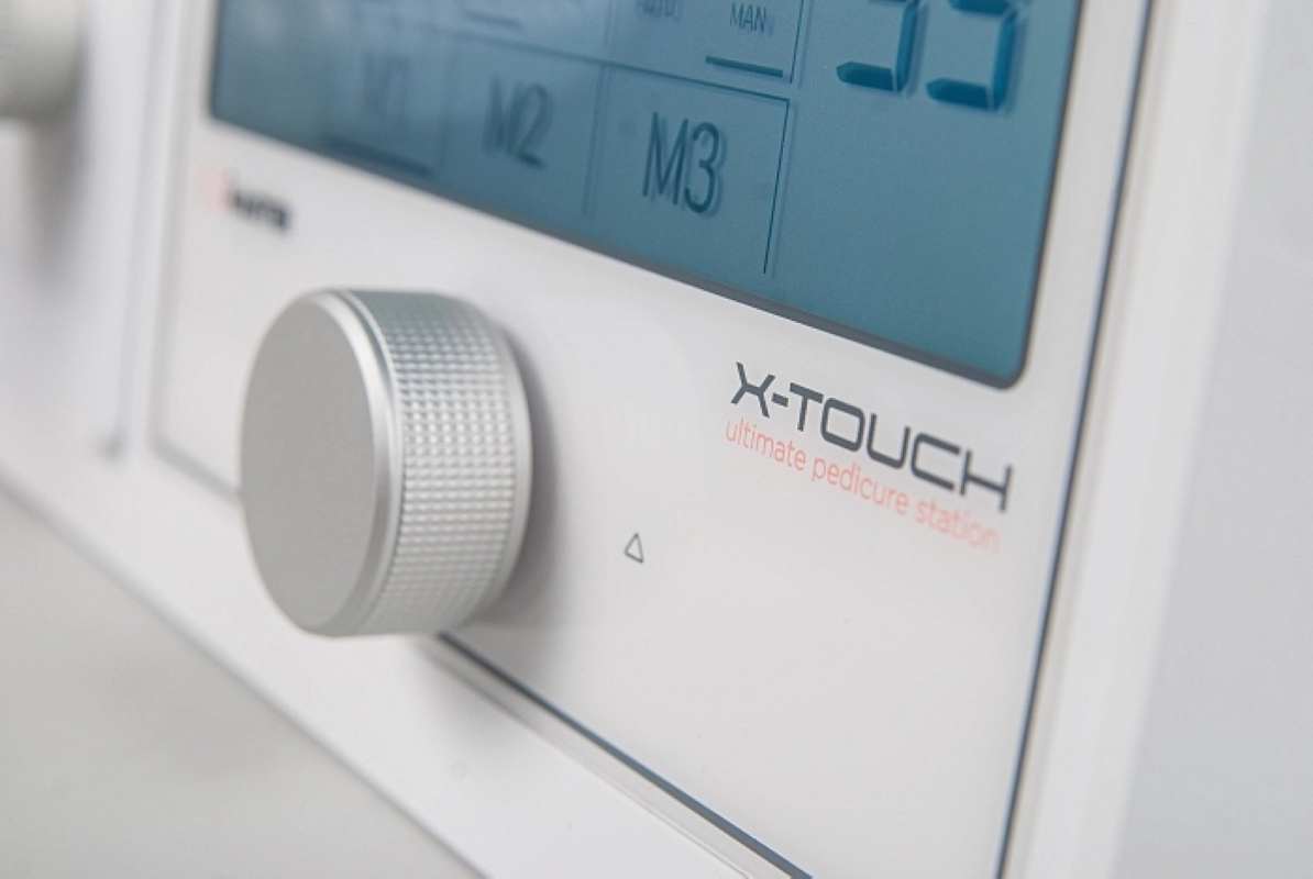Профессиональный аппарат для педикюра и подологии с мощным встроенным пылесосом AirMaster X-TOUCH оснащён удобным сенсорным дисплеем и подсветкой наконечника.