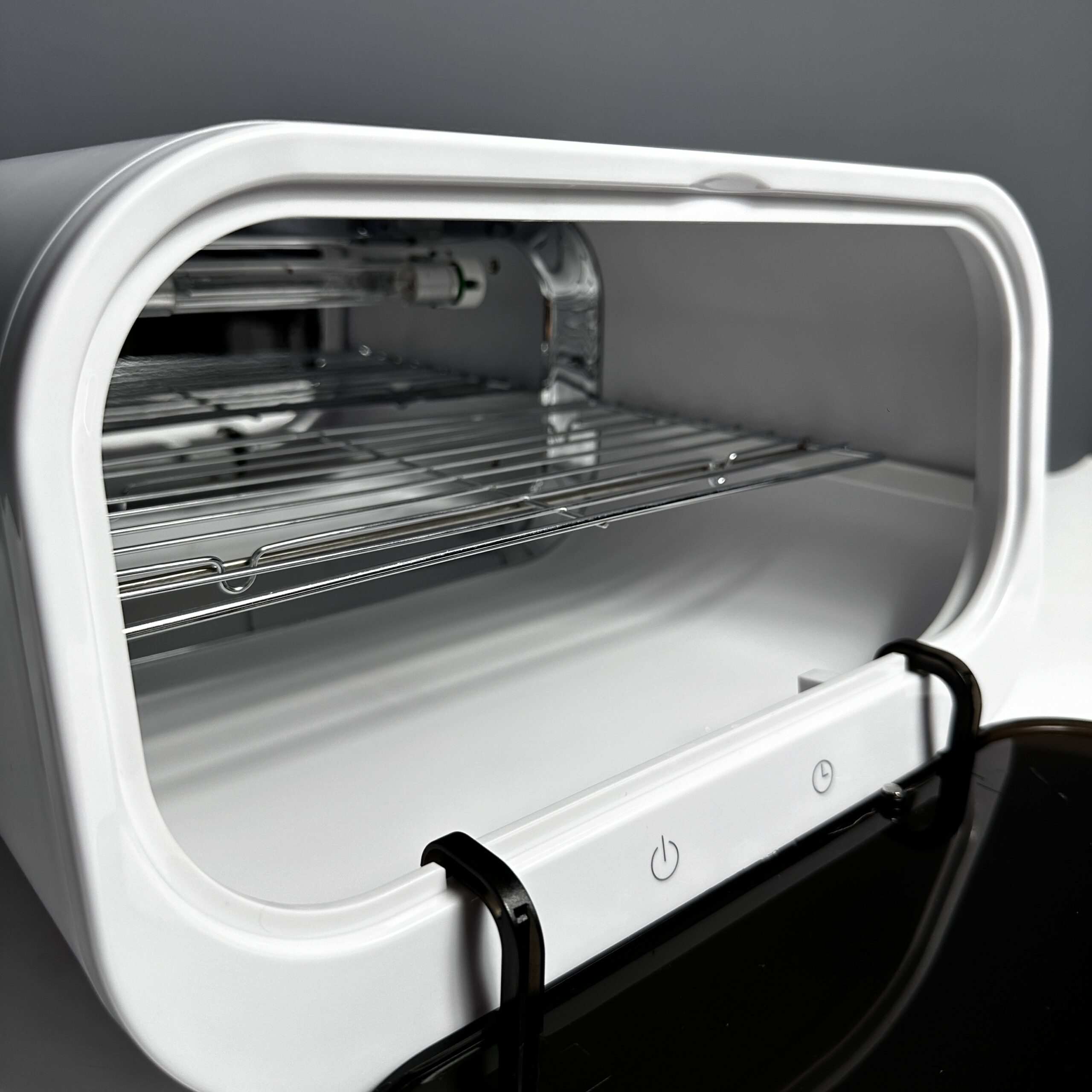 Бактерицидная лампа, расположенная внутри камеры, обеспечивает ультрафиолетовое излучение, достаточное для поддержания стерильной среды. Устройство оснащено механизмом автоматического отключения, срабатывающим при открытии крышки. Предназначено только для поддержания стерильного состояния инструмента, перед помещением в камеру инструмент должен обязательно пройти полную стерилизацию термическим способом.