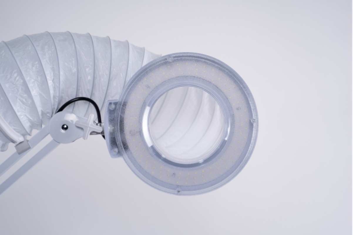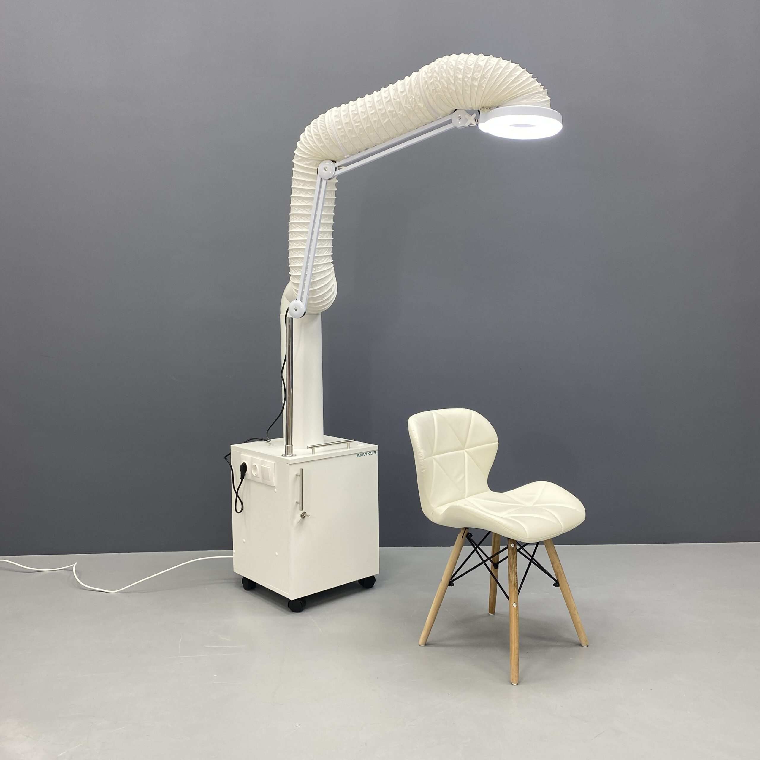 Мобильная вытяжка-пылесос для салонов красоты с дополнительным освещением и усиленной системой фильтрации воздуха.